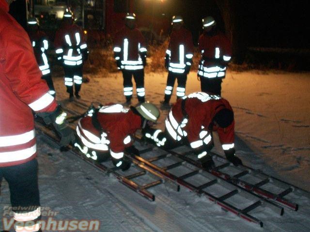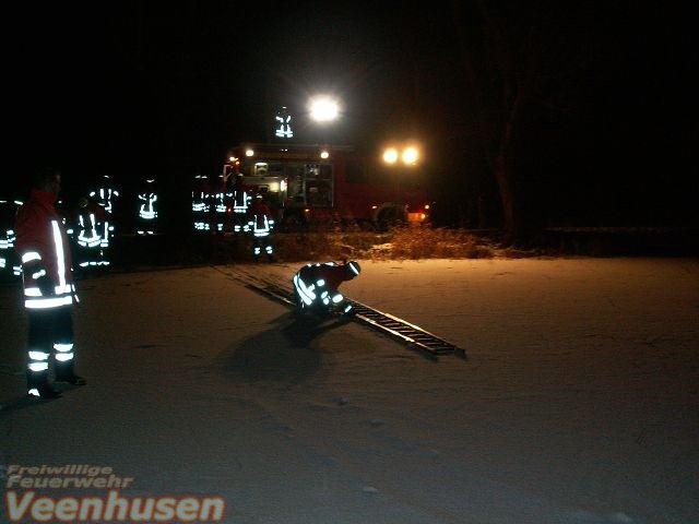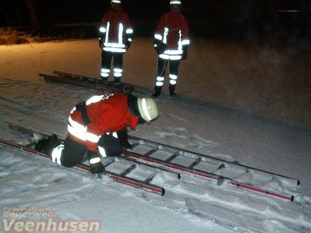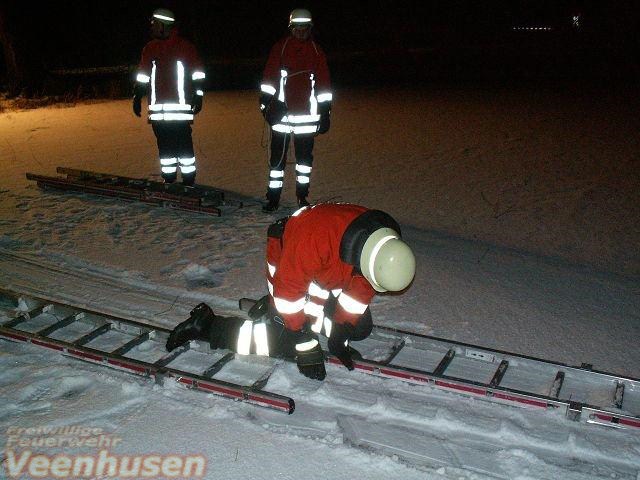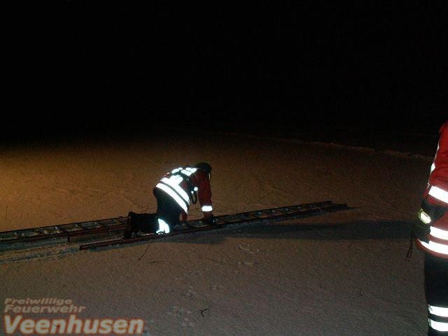 Eine eingebrochene Person im Eis. Mit der 4 teiligen Steckleiter und viel Körpereinsatz wurde die Person aus dem Eis gerettet.