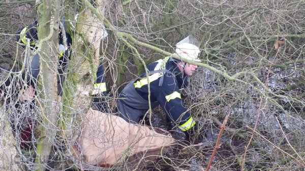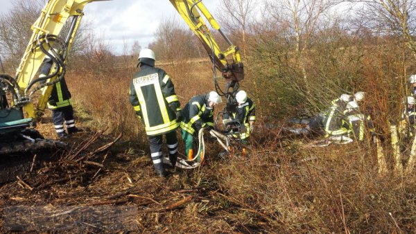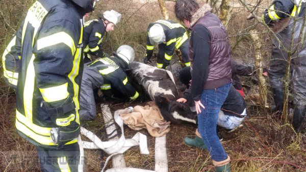 Bis zum Eintreffen des Baggers gelang es den Feuerwehrleuten jedoch schon das völlig erschöpfte Pferd mit Muskelkraft soweit aus dem Graben zu ziehen, das kaum noch die Gefahr des Ertrinkens bestand. Mit Hilfe des Baggers wurde das Pferd dann noch das letzte Stück aus dem Graben gezogen.