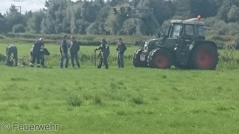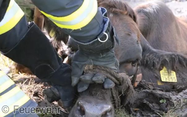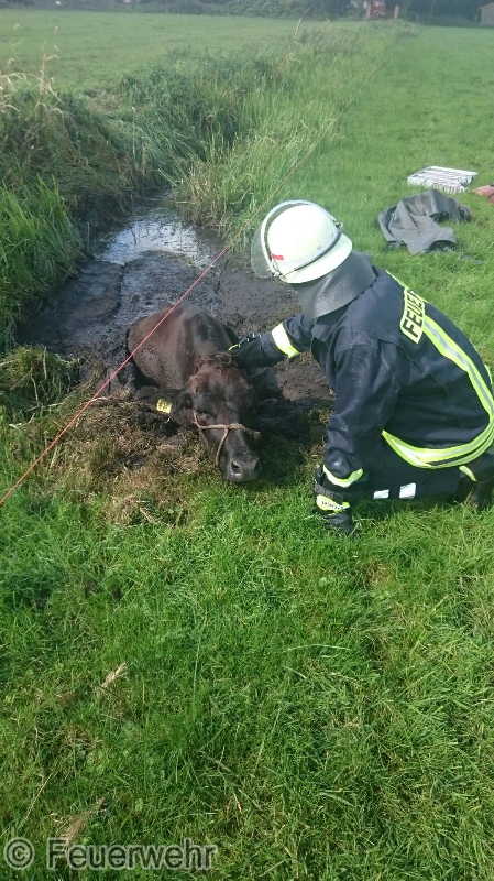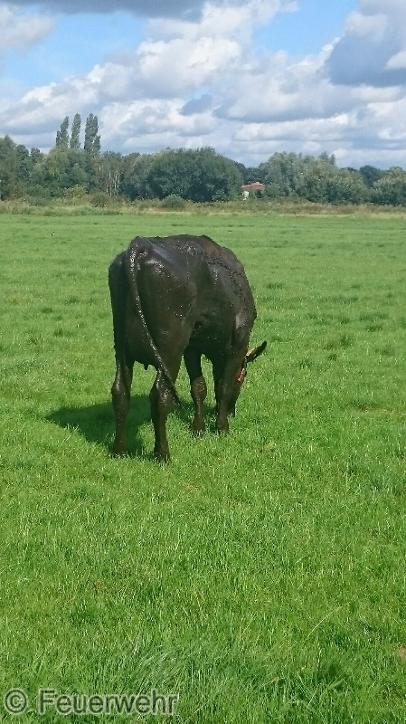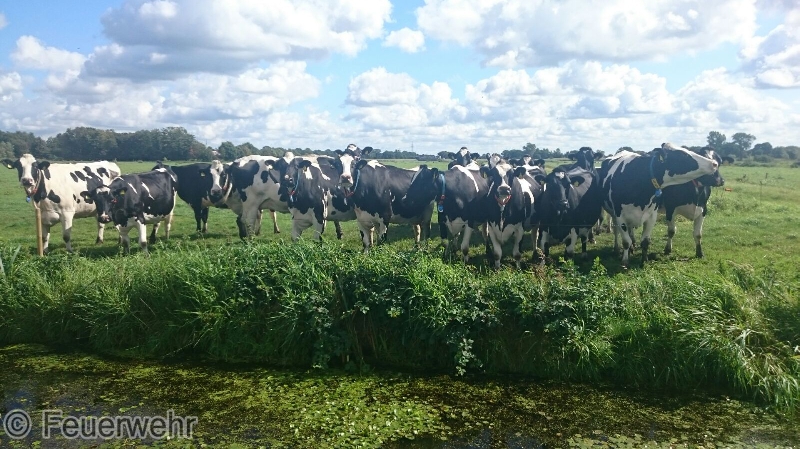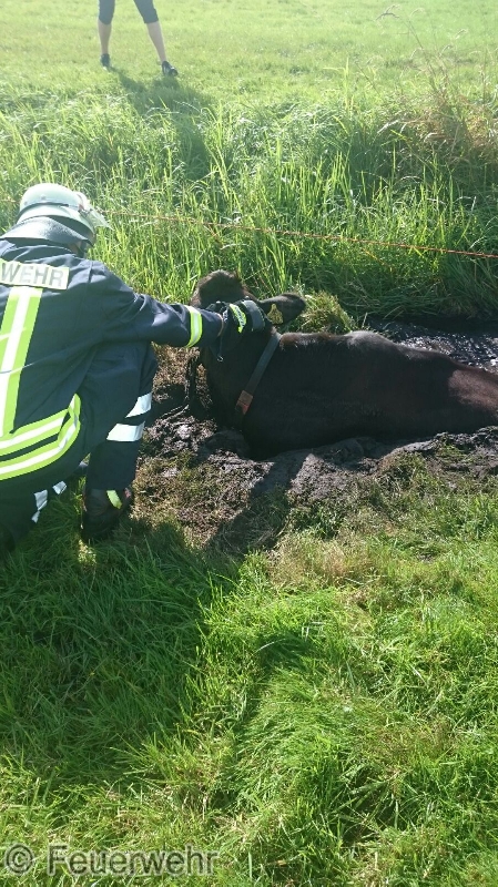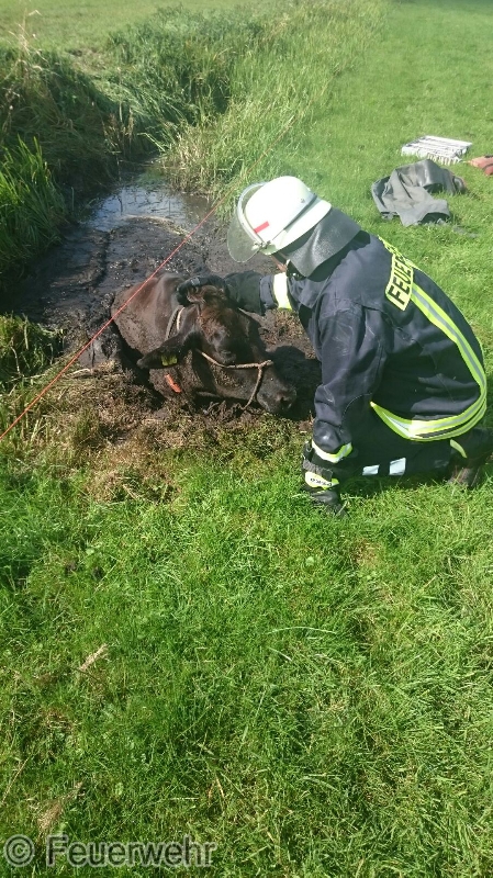 Nur durch Zufall hatte am Donnerstagmittag ein Busfahrer eine in Not geratene Kuh in Veenhusen entdeckt. Der Mann hatte mit seinem Bus an der Altschwoogstraße seine Mittagspause begonnen, als ihm der Kopf einer Kuh, aus einem Graben ragend, auffiel. Das Tier steckte im Schlamm eines Entwässerungsgrabens fest. Er verständigte die Feuerwehr über die Regionalleitstelle Ostfriesland.Wenige Minuten später war die Feuerwehr vor Ort. Die Kuh war bereits stark geschwächt, sodass die Einsatzkräfte nicht mehr auf die Unterstützung der Kuh bei der Rettung setzten konnten. Das Tier nur mit Muskelkraft aus demmoorigen Schlamm zeigte sich als nahezu unmöglich. Die Einsatzkräfte verständigten befreundete Landwirte, die hilfsbereit nach kurzer Zeit an der Einsatzstelle eintrafen. Inzwischen wurde die Kuh von der Feuerwehr betreut. Ein Kamerad hatte sich bereits mit einer Watthose ausgerüstet und war in den Graben gestiegen. Der Kuh wurden dann noch Tragegurte angelegt, die am Frontlader eines Traktors befestigt wurden.