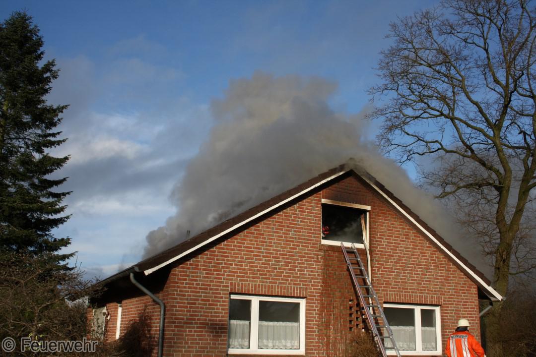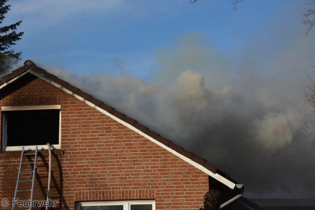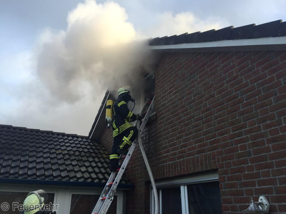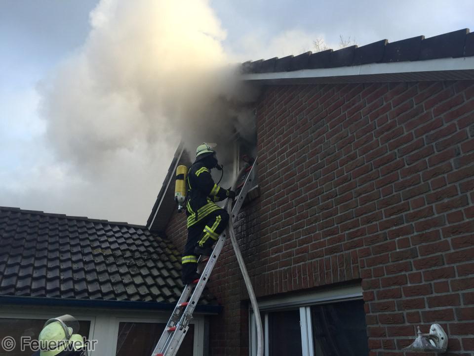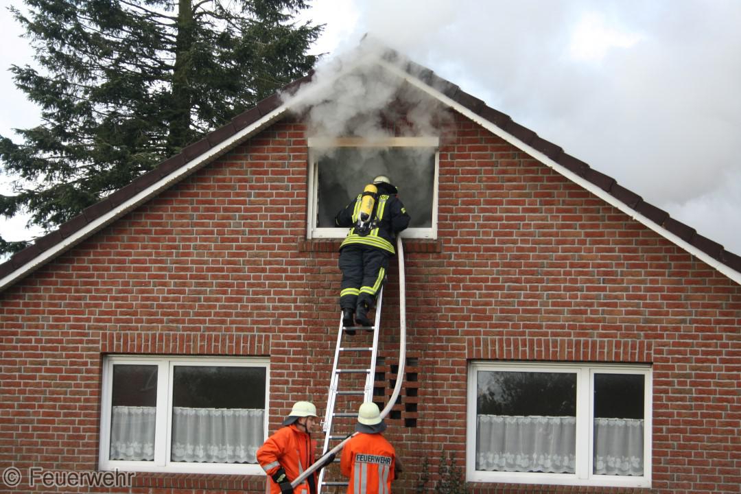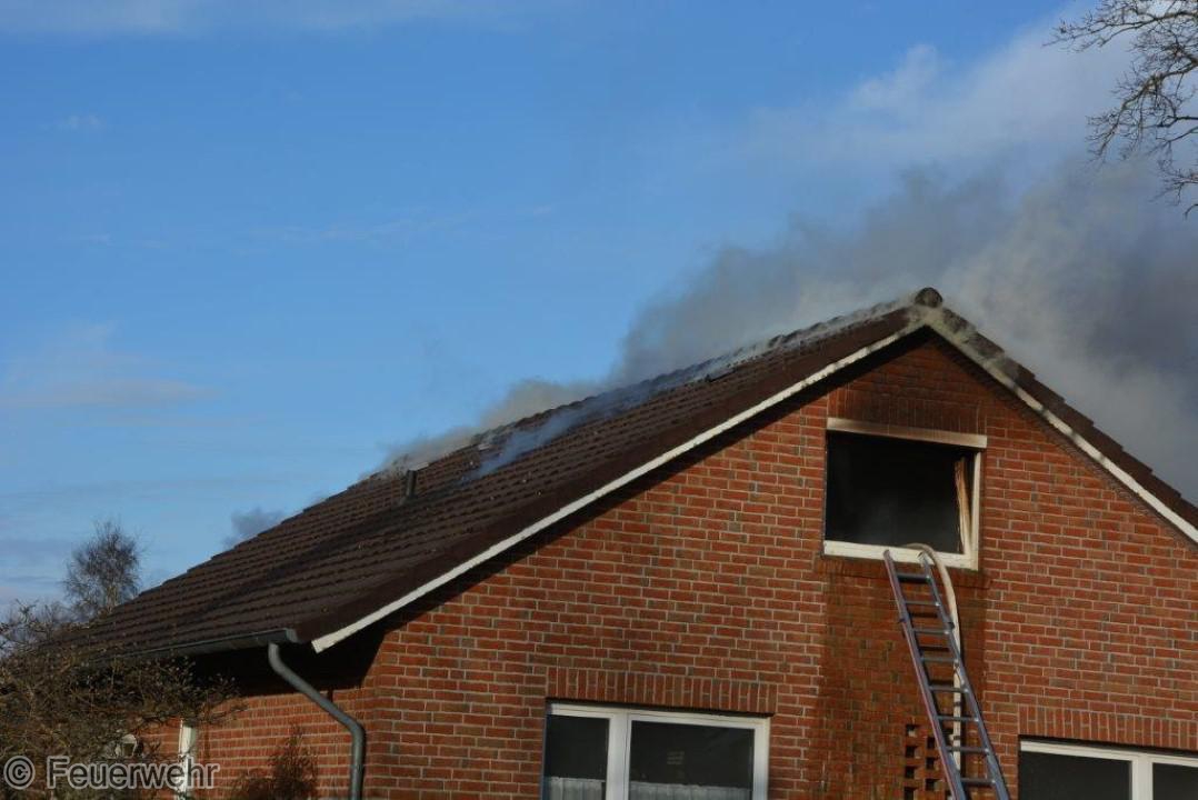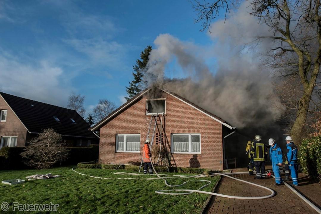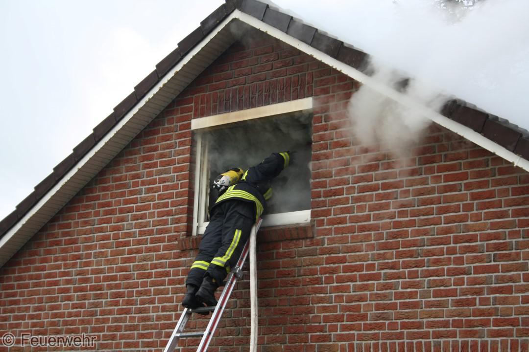 Dichter Rauch quoll beim Eintreffen der Einsatzkräfte bereits aus den Fenstern im Dachgeschoß. Der Bewohner hatte das Haus noch rechtzeitig verlassen können, wurde jedoch leicht verletzt und musste im Krankenhaus weiter behandelt werden. Unter schwerem Atemschutz gingen die Einsatzkräfte über mehrere Angriffswege ins Gebäude vor. Das Feuer hatte sich bereits ausgebreitet und war auf den Dachstuhl übergegriffen.
