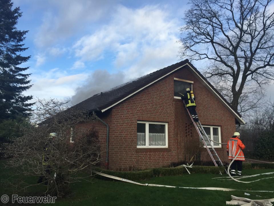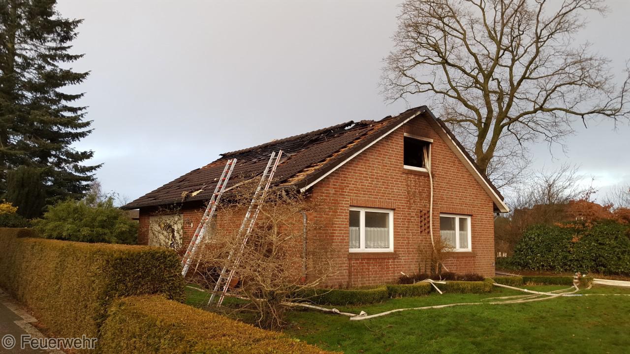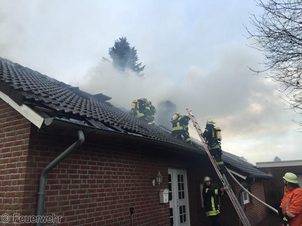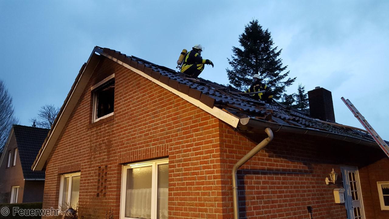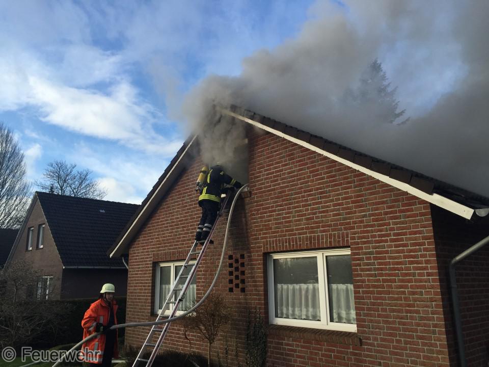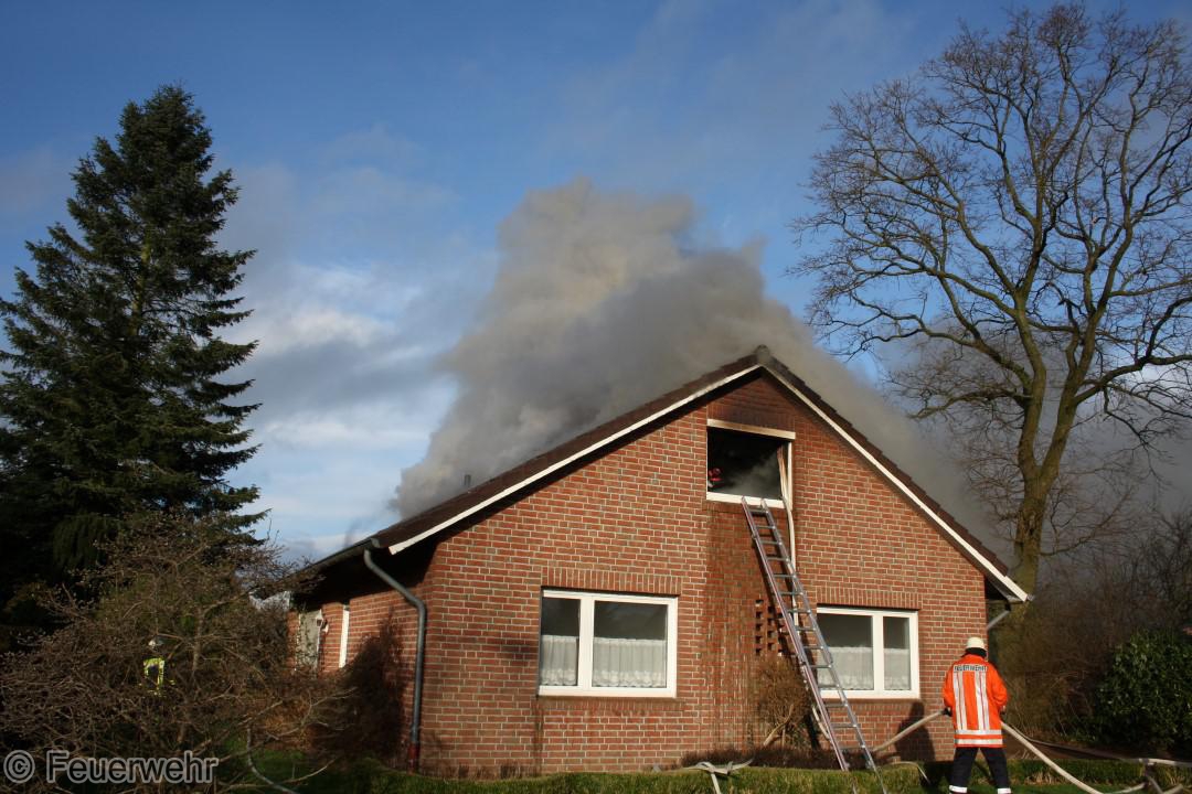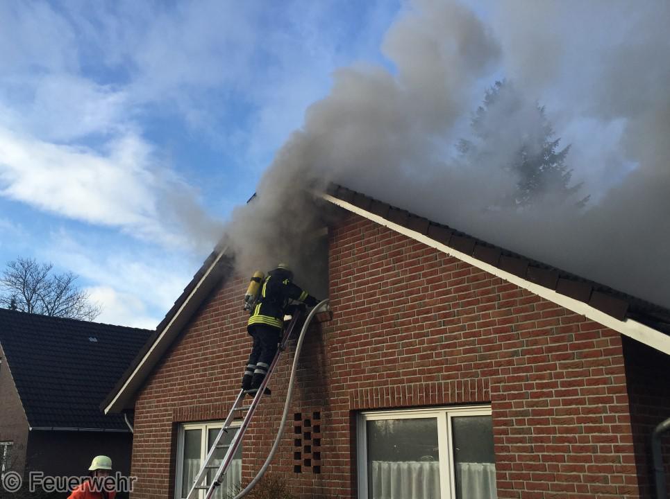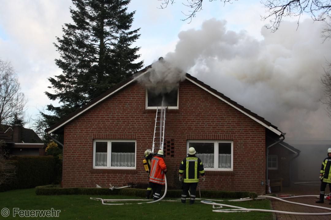 Dichter Rauch quoll beim Eintreffen der Einsatzkräfte bereits aus den Fenstern im Dachgeschoß. Der Bewohner hatte das Haus noch rechtzeitig verlassen können, wurde jedoch leicht verletzt und musste im Krankenhaus weiter behandelt werden. Unter schwerem Atemschutz gingen die Einsatzkräfte über mehrere Angriffswege ins Gebäude vor. Das Feuer hatte sich bereits ausgebreitet und war auf den Dachstuhl übergegriffen.
