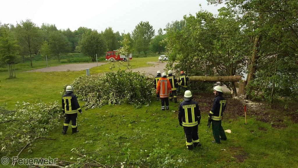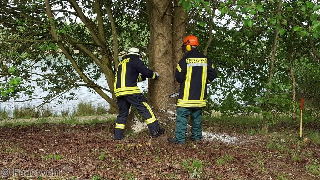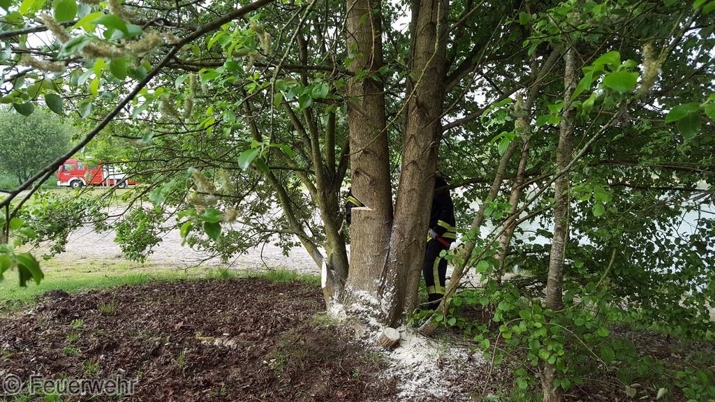 An einem Baum am Badesee war die Baumkrone abgebrochen und im Geäst hängen geblieben.
