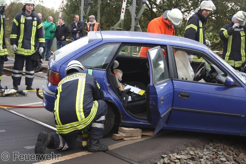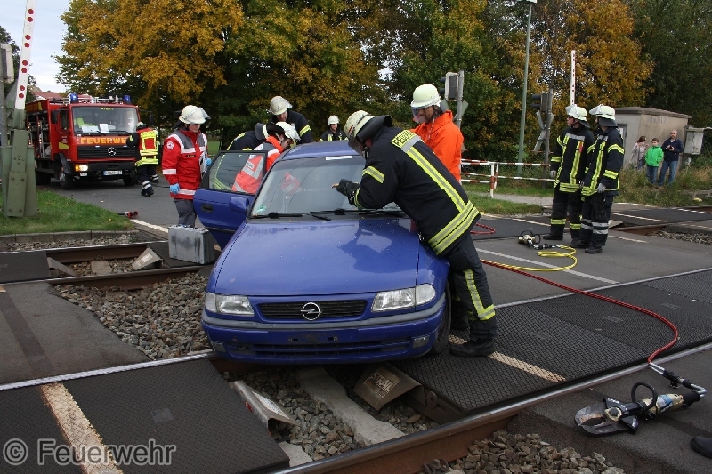 Die Einsatzkräfte der alarmierten Feuerwehr Neermoor sowie des Rüstwagens der Kreisfeuerwehr wussten jedoch noch nicht, dass es sich um eine Übung handelte. Beim Eintreffen der ersten Kräfte bot sich zunächst eine relativ unübersichtliche Lage. Auf dem Bahnübergang stand ein schwer beschädigter PKW, darin eine schwer eingeklemmte Person und ein Kleinkind. Ein ganzes Stück weiter auf dem Gleis stand ein Zug, eine Westfalen-Bahn, die aus dem Triebwagen heraus qualmte. Neben dem Zug lag ein Teil der abgerissenen Oberleitung und darauf eine vermeintliche Person, die wie auch die Eingeklemmten im PKW von einer Puppe gespielt wurden.